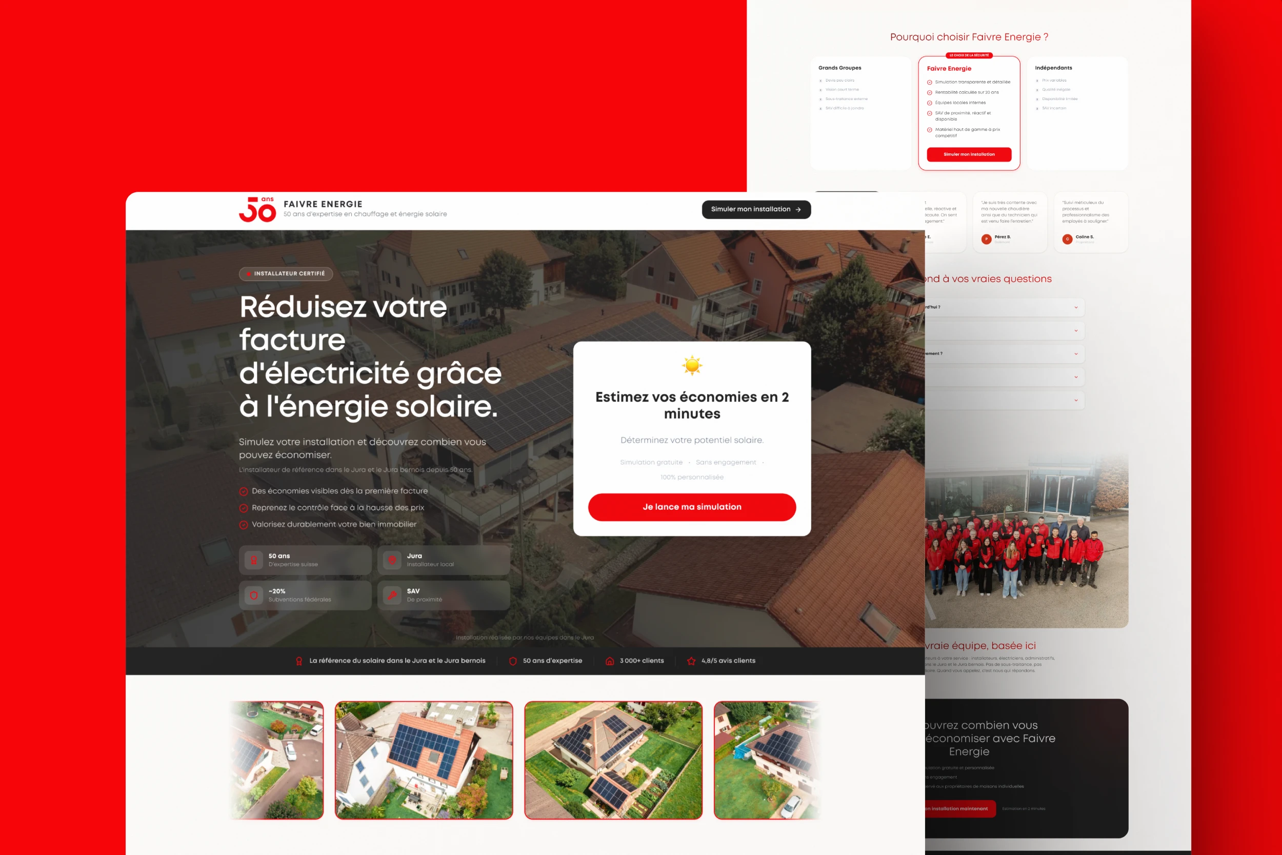 Des visuels qui montrent les installations réalisées et les bénéfices concrets du solaire pour les propriétaires jurassiens.